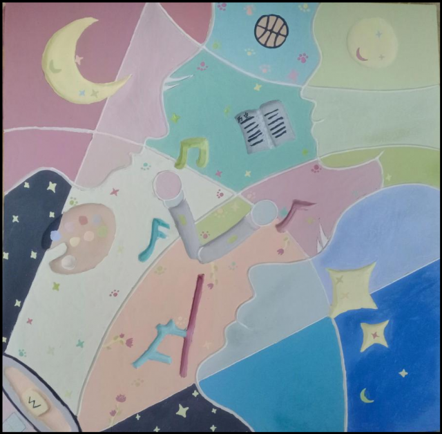 作品介绍:我本人比较喜欢舞蹈,并且也在学校参加了许多舞蹈相关的活动,所以以此为基础,创作了这幅作品。此次作品分为三层,第一层是底下的黄色,代表着希望;第二层是手和跳舞地人,手代表着我学习过程中的“贵人”;第三层是蓝天,代表着未来。