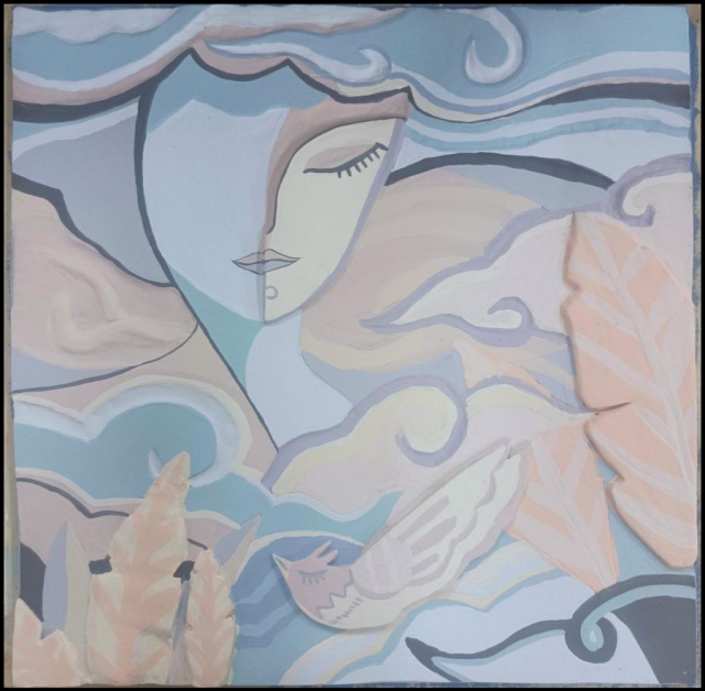 作品介绍:《听风》花旦美人画,造型上,用抽象艺术勾勒出了一个面若桃花,柳眉如弯月的花旦美人,周围加上卷云,枝叶,小鸟进行装饰,美人垂眸,听清风从发丝吹过,整张画面唯美的同时又展现着生命的张力。色彩上,整体是梦幻的紫罗兰色系,再添加强对比的黄色形成强烈的视觉反差,增强了整体的色彩层次。有古典沉静美又不现代感。