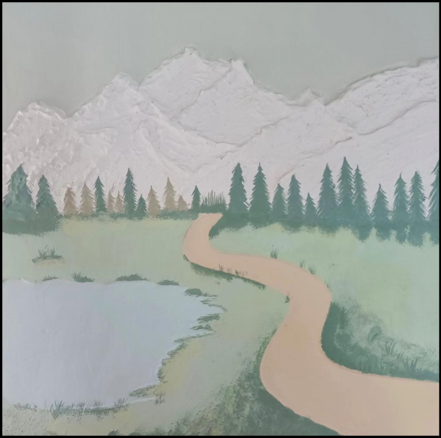 作品介绍:这副作品来源于一副我很喜欢的风景画,通过运用抽象的色块拼接,丰富画面色彩的同时将景色全部融入,最后呈现出了这副肌理画。
