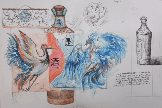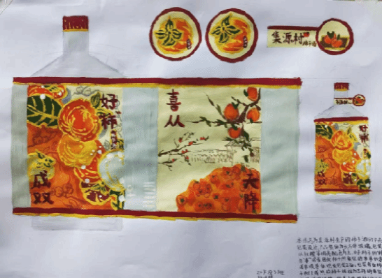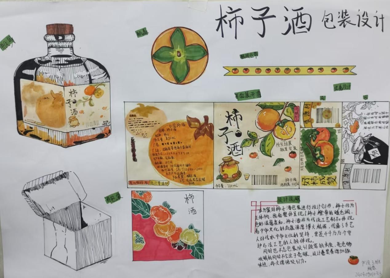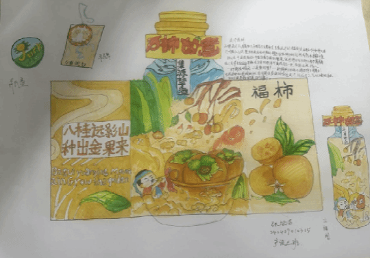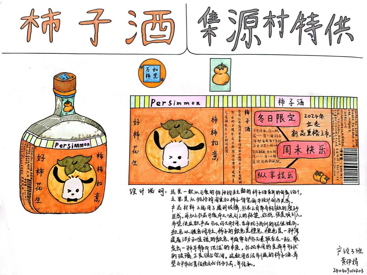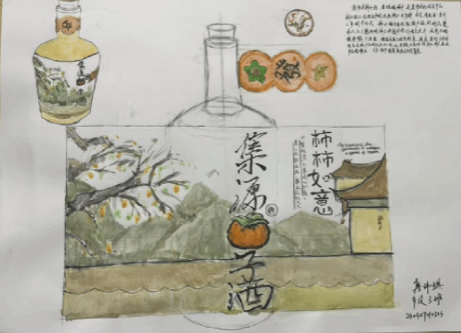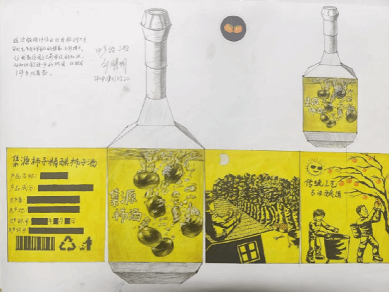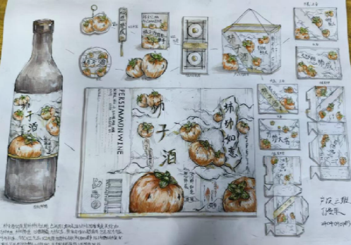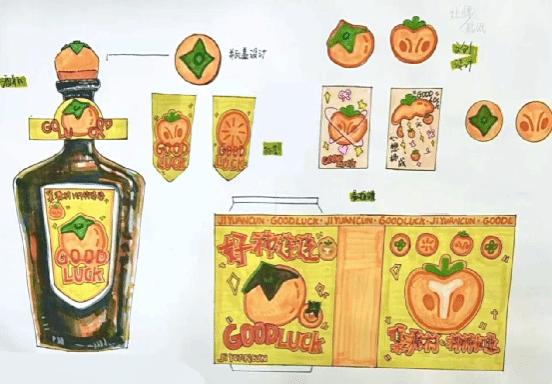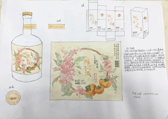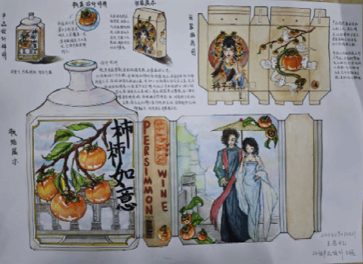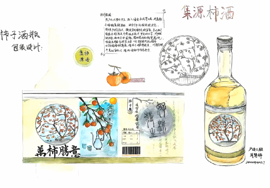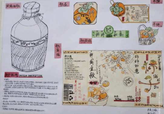 《构成基础I、II》课程是产品设计专业的一门重要的专业基础课程,主要研究创作思维及色彩规律,平面构成与色彩构成是培养创意思维的专业基础课,与立体构成并称三大构成。作为设计思维的基础训练,平面构成与色彩构成摒弃功能、材料、工艺、造价等与设计相关的思考,而单纯性地把注意力集中在造型能力、色彩运用的训练上,尤其通过抽象的形态体现形式美的法则,培养形象思维的敏捷性。同学们将构成知识运用于柿子酒的产品设计中,同学们的这些作品以其独特的色彩和构图,包含其形象思维能力和设计创造能力。